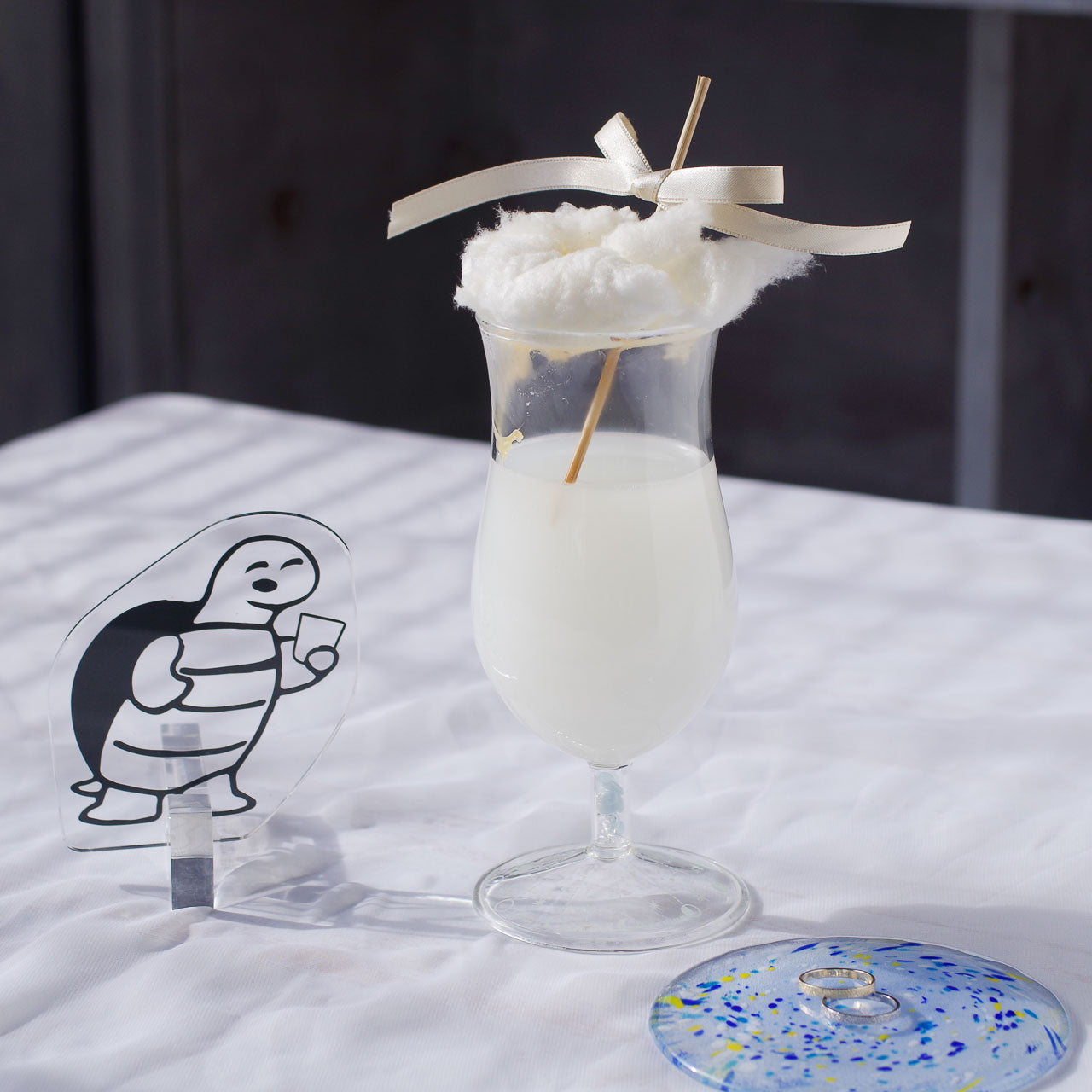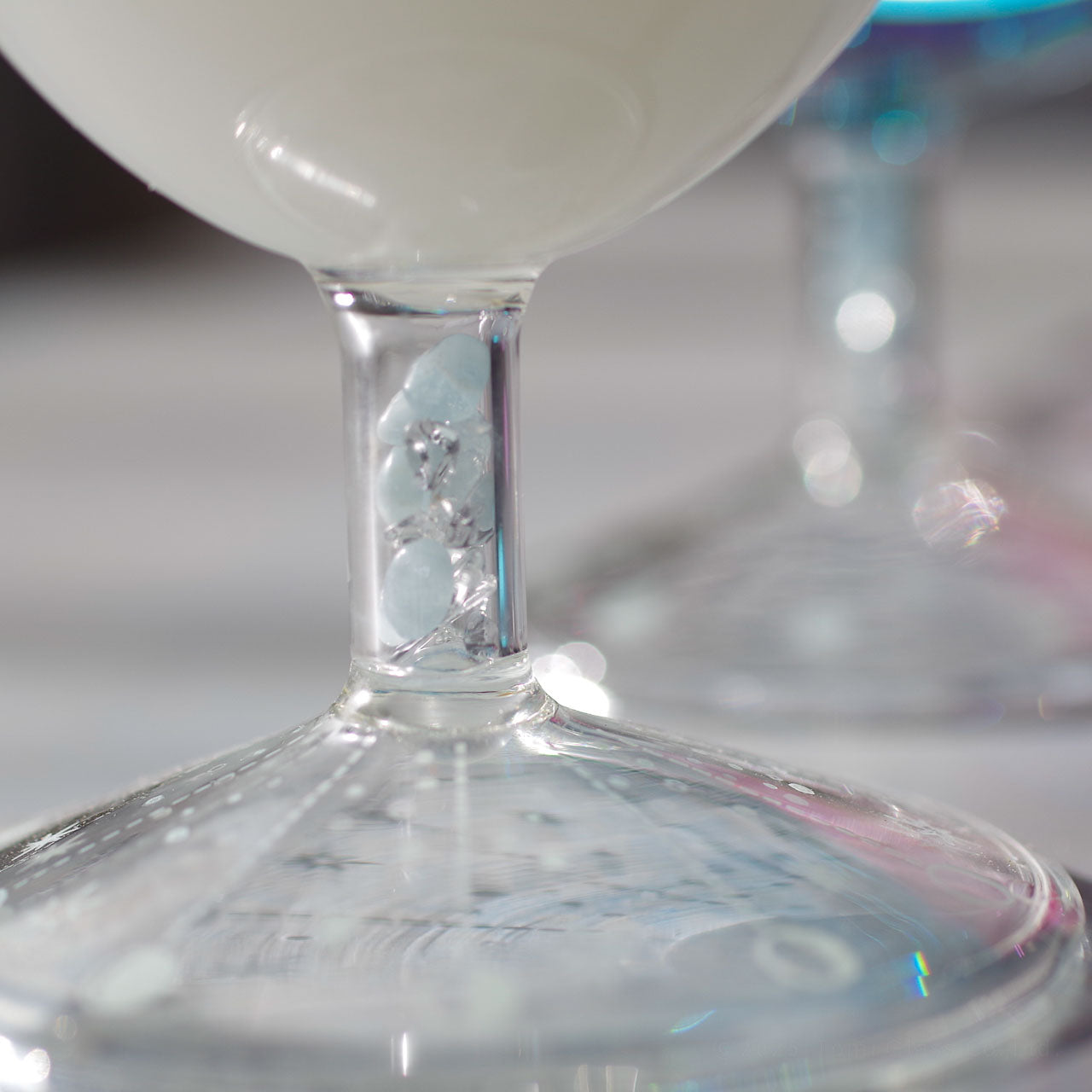 色が付いた天然石+水晶をミックスしてより輝きが出るように調合。パワーストーン入りのピルスナーはビールをはじめ、シャンパングラスとしても。このグラスでお酒を呑むとなんだかパワーをもらえそうです。(Anna Okanami 2017)