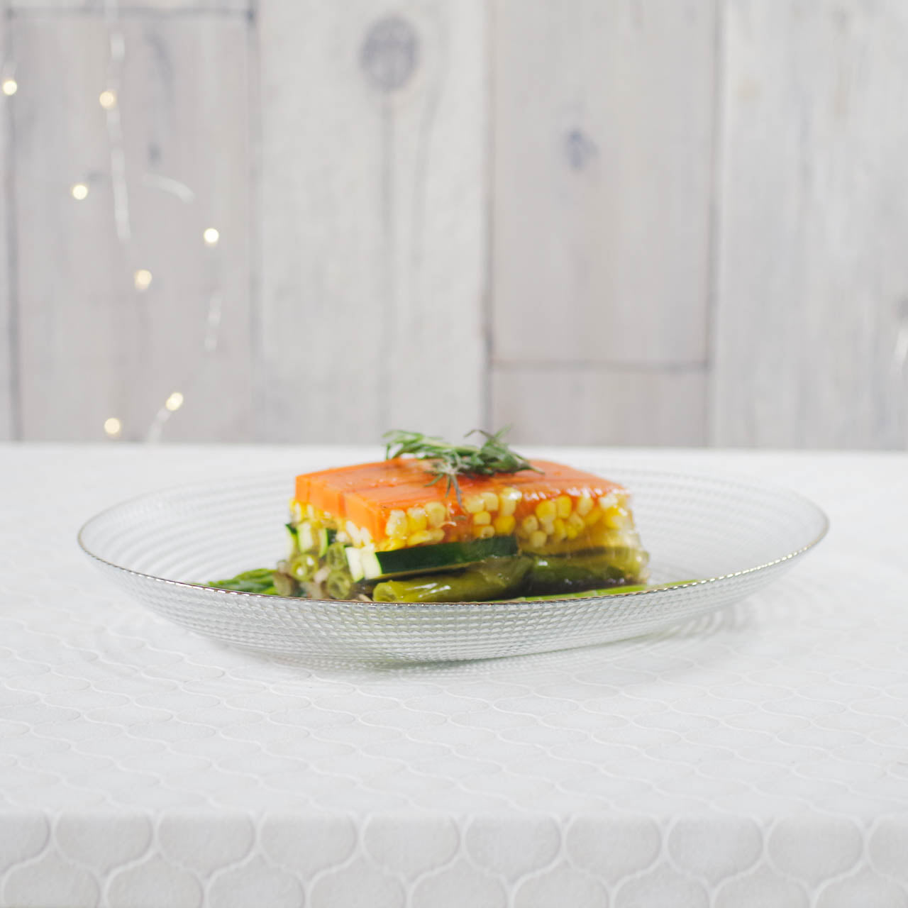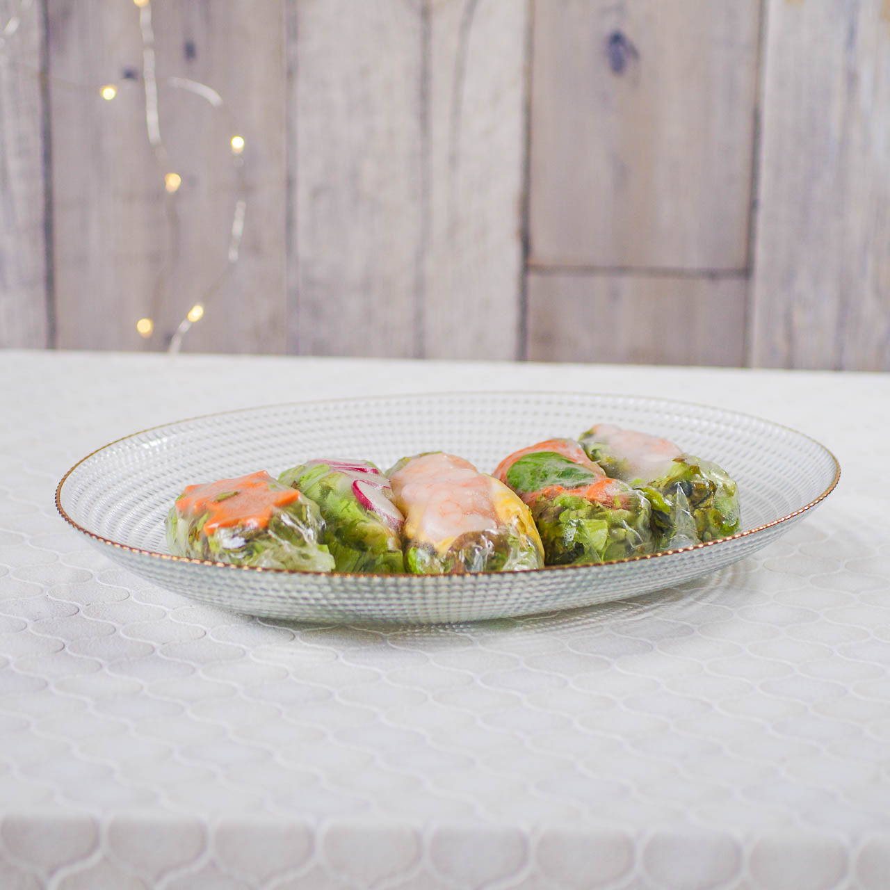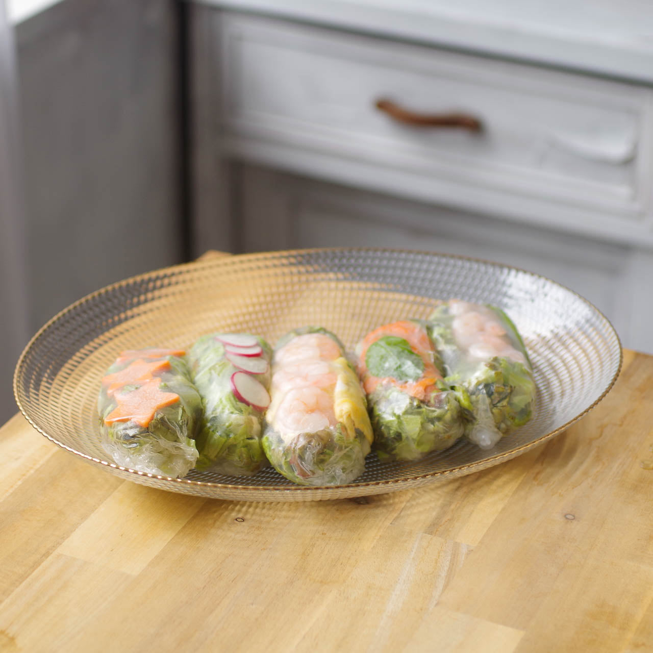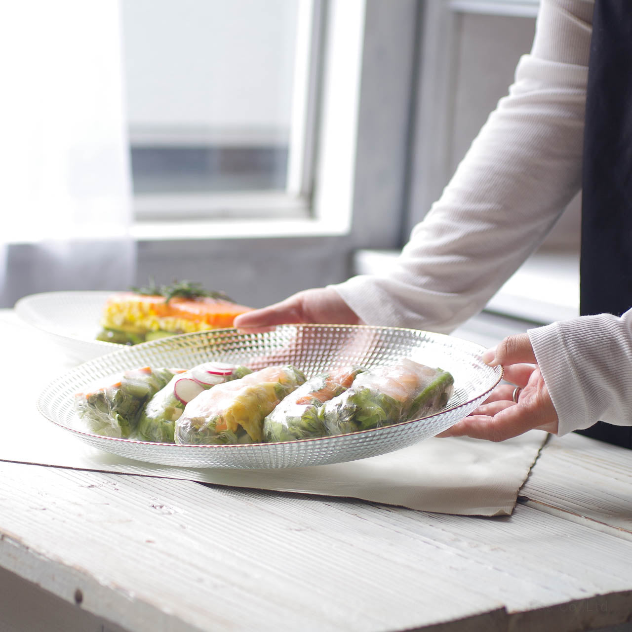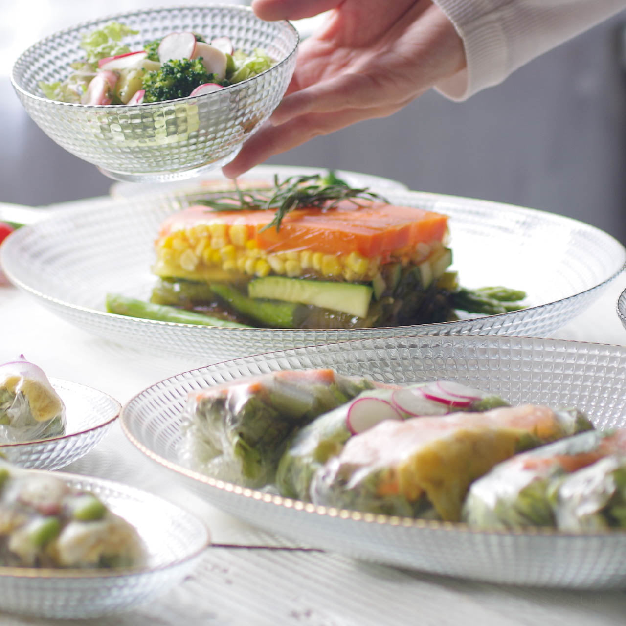 オーバルのガラスの大皿は、職人が1点ずつ手をかけてフチに金を巻いています。ふだんの食卓に取り入れやすい、シンプルでちょっぴりゴージャスなデザインになっています。