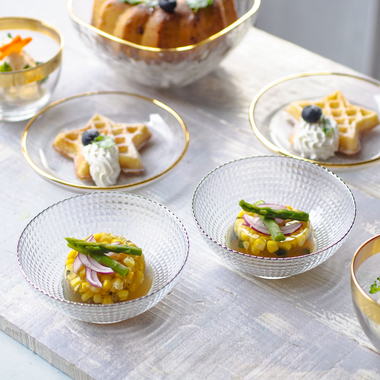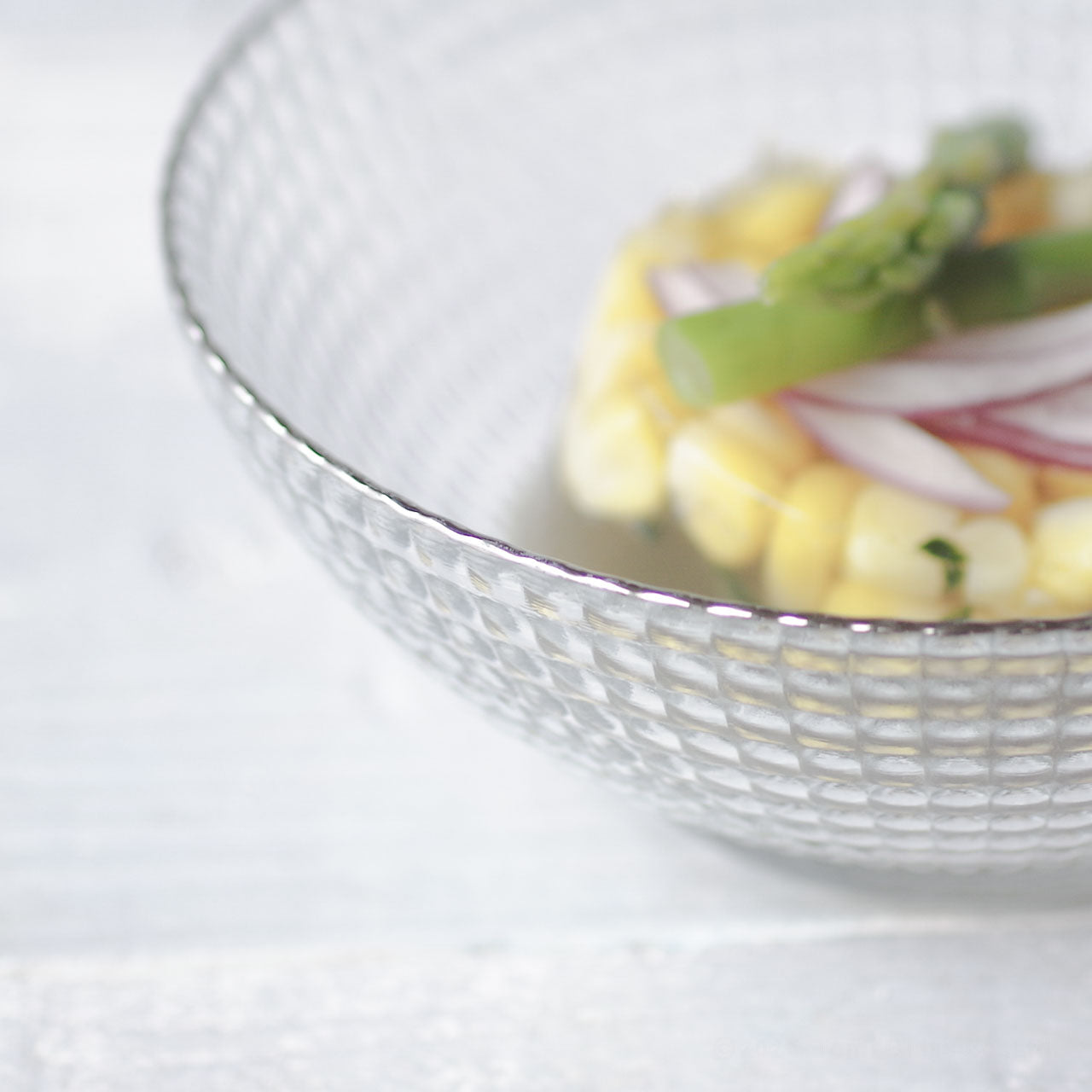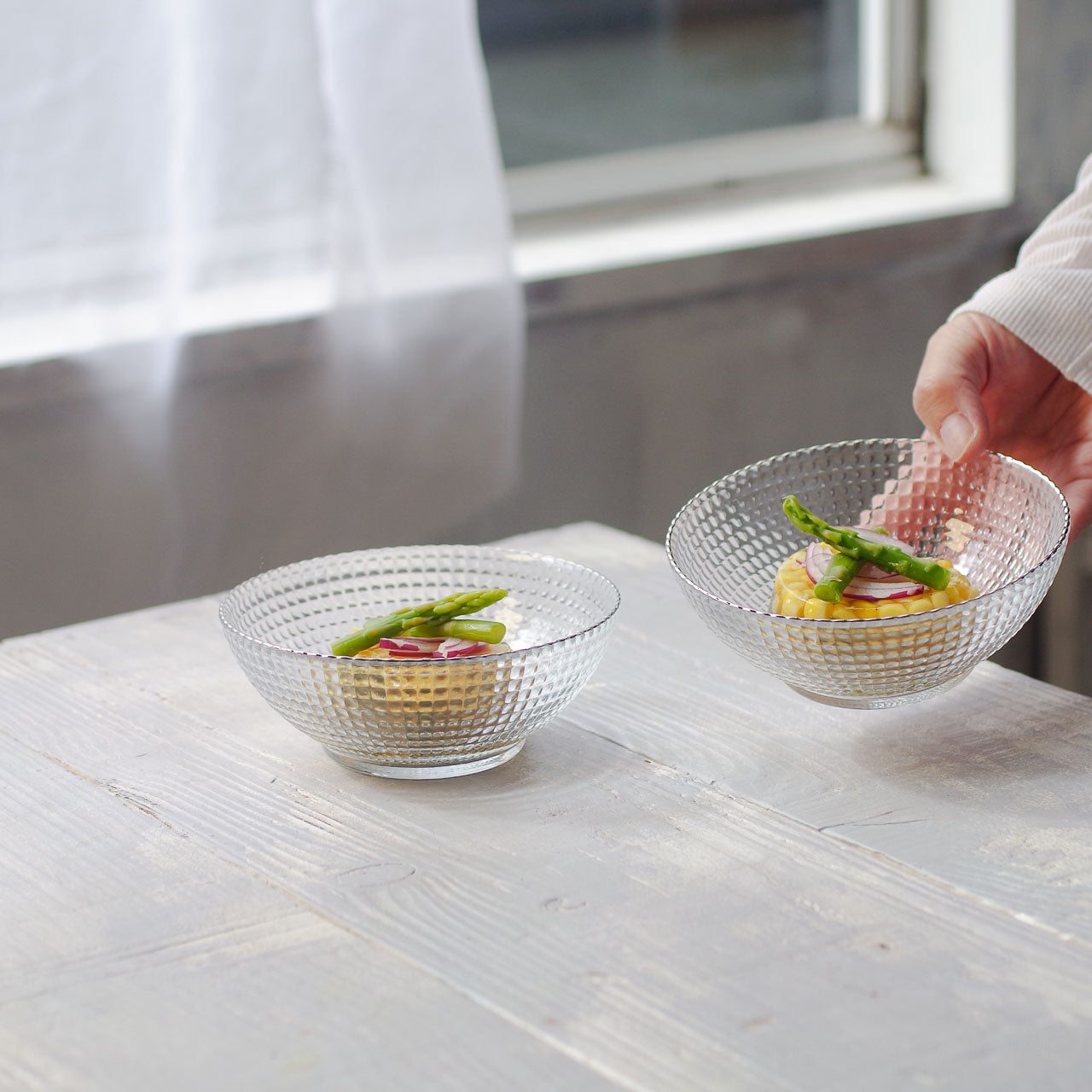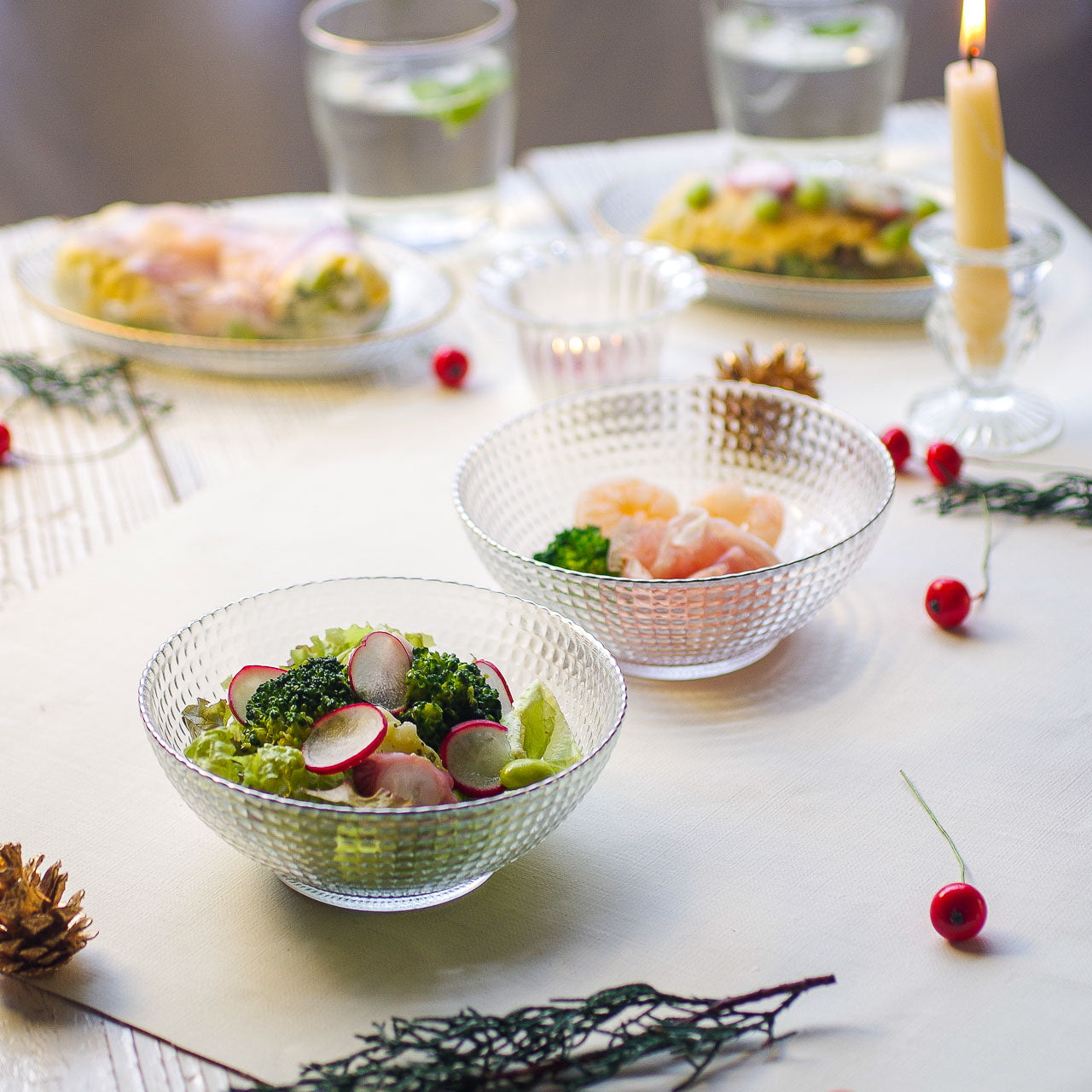 使いやすいガラスボウルが2個セットで、お求めやすくなっています。職人が1点ずつ手をかけてフチに金を巻いています。フチがこまかい波うったデザインのため、金を巻いた部分が個性的です。ふだんの食卓に取り入れやすい、シンプルでちょっぴりゴージャスなデザインになっています。