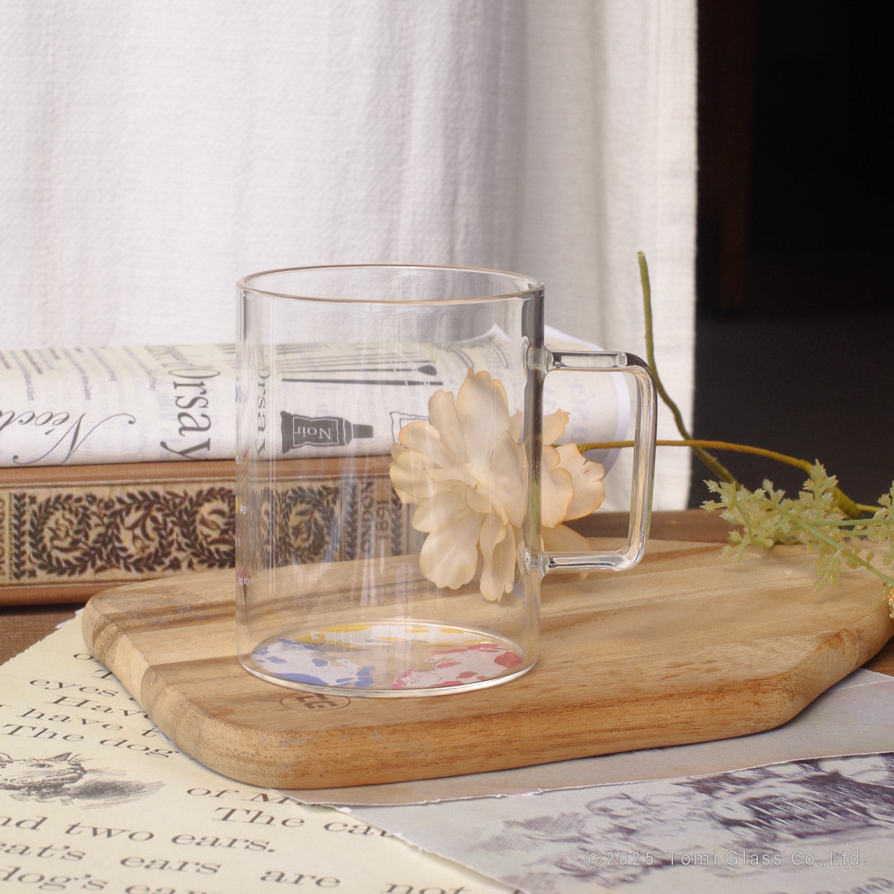 ホットも電子レンジもOKな、耐熱ガラスのプリントマグです。