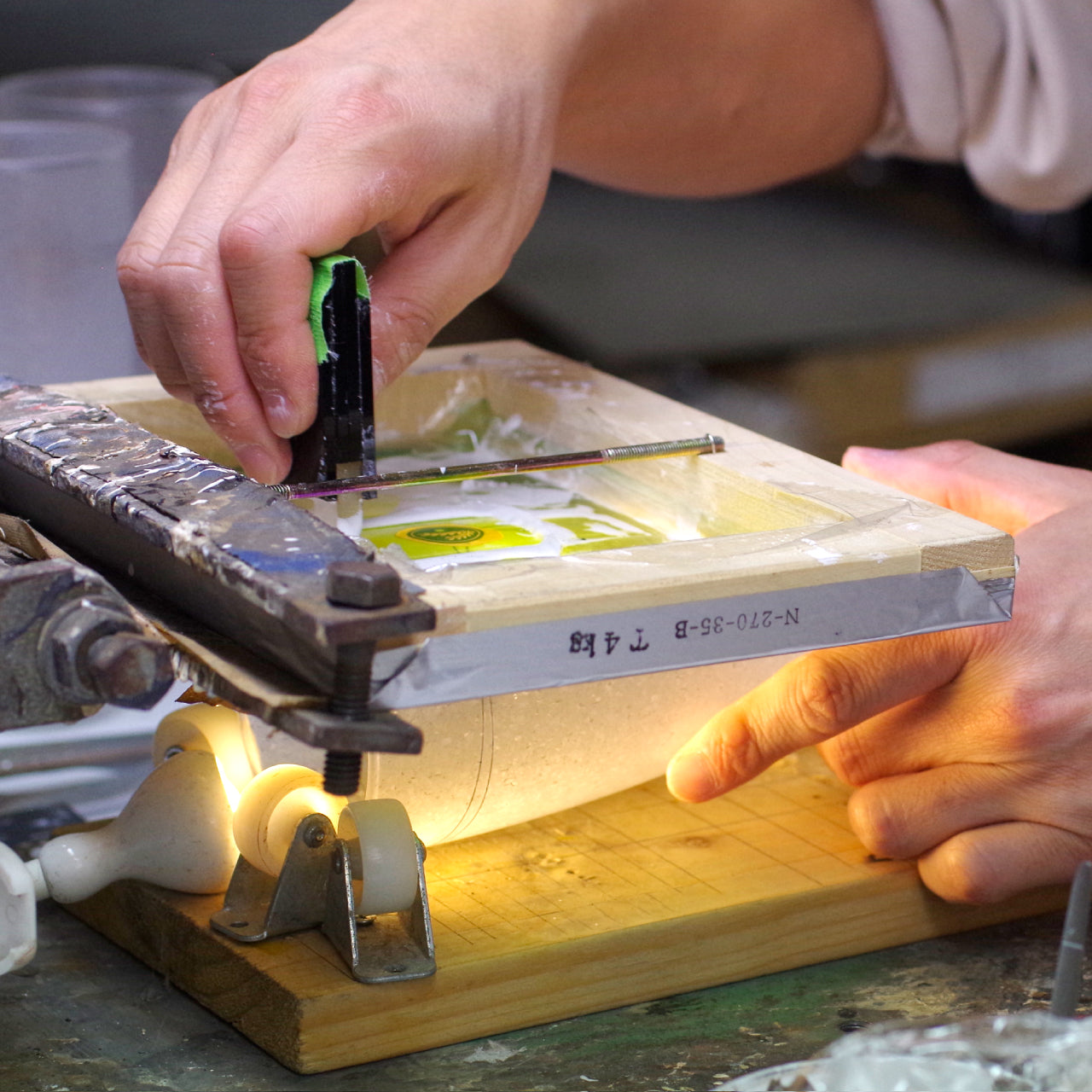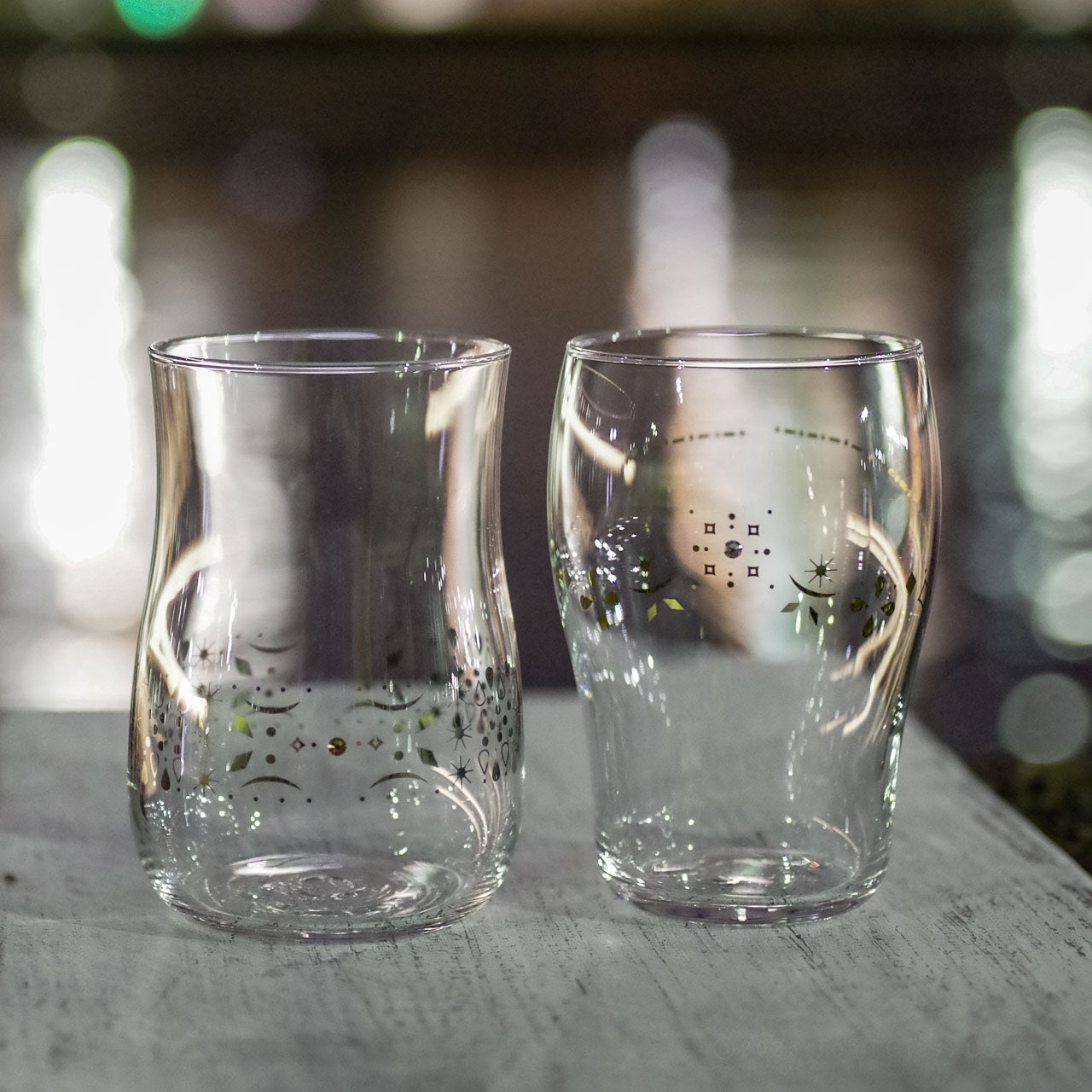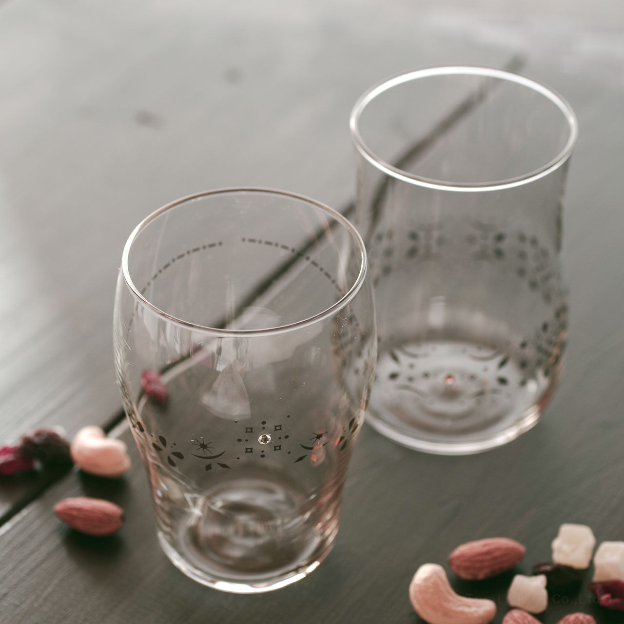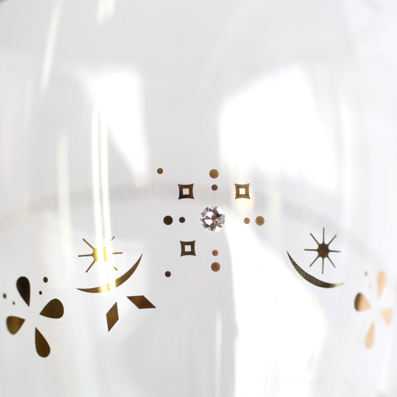 東京・下町の硝子プリントの職人が、1点ずつハンドプリントをしました。また、クリスタル製のラインストーンを富硝子自社で1粒ずつ手作業で付けています。