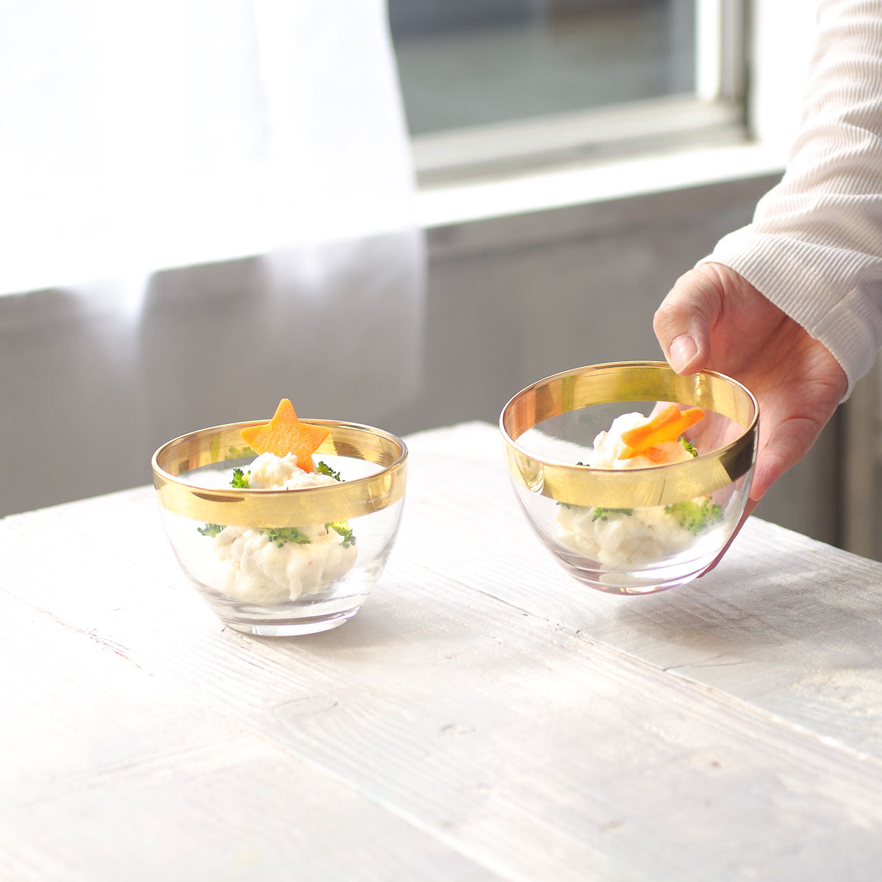 一部に金の部分に「かすれ」がございますため、ワケアリ品としてセットで特別価格にてご用意いたしました。ガラスボウルの2個セット。直径10cmなので、持ちやすく洗いやすいです。東京都で、1点ずつ手作業で金やプラチナをふちどりしています。