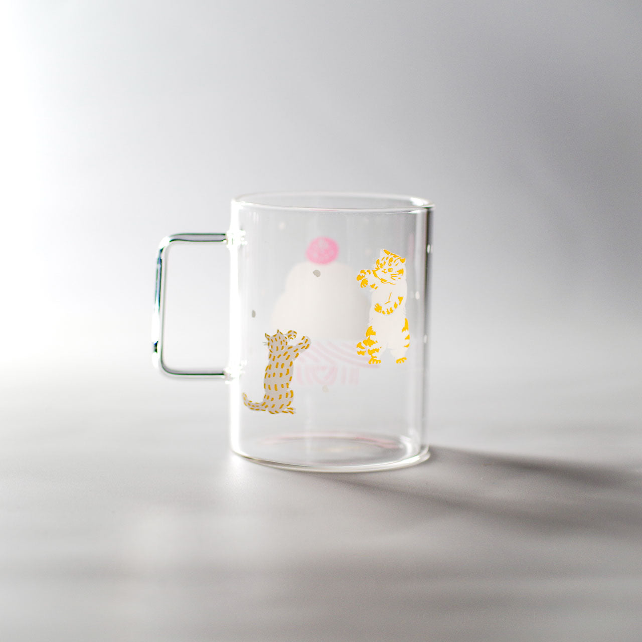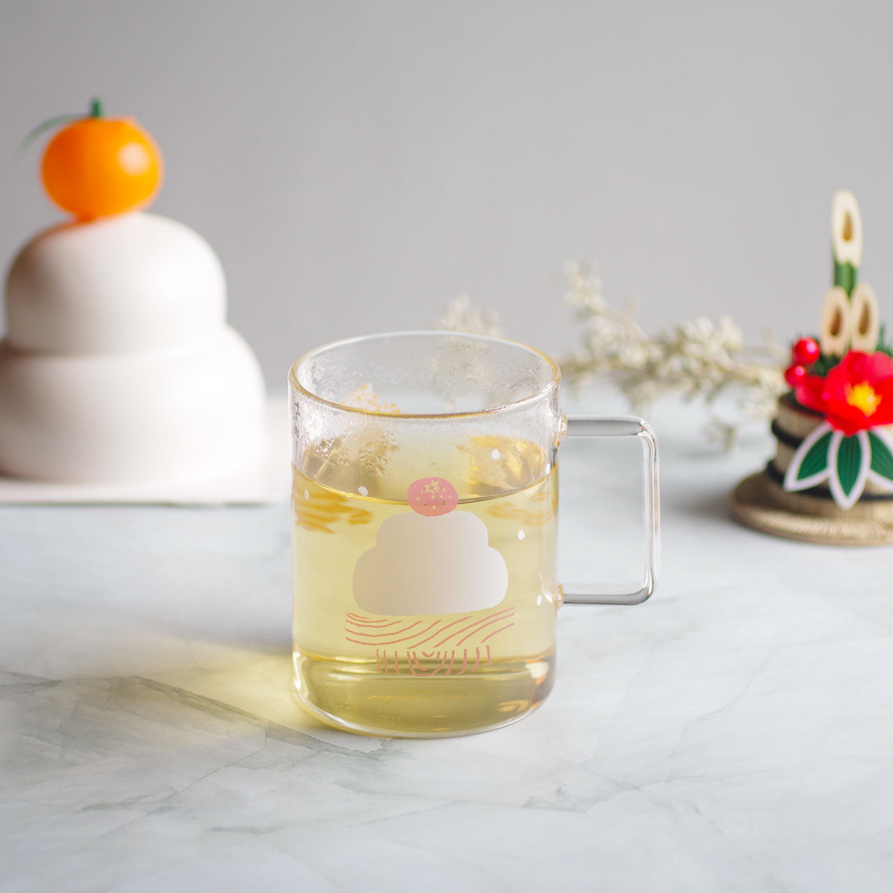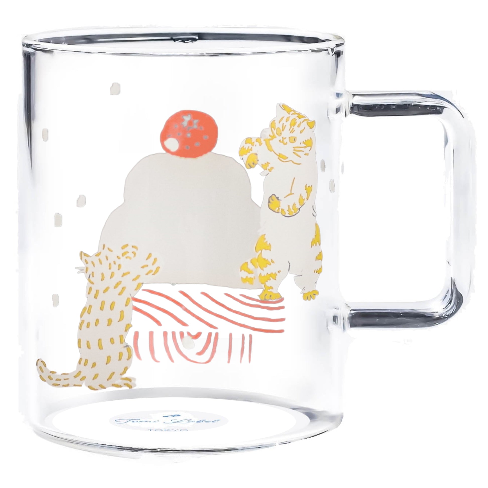 鏡もちを囲む猫のイラストがかわいい、限定5個の耐熱ガラスのマグです。