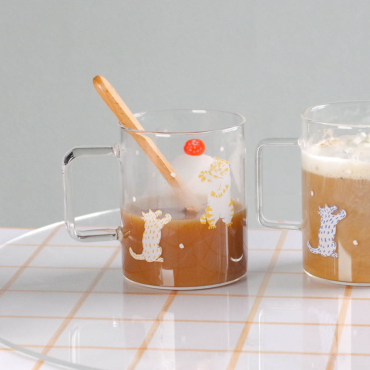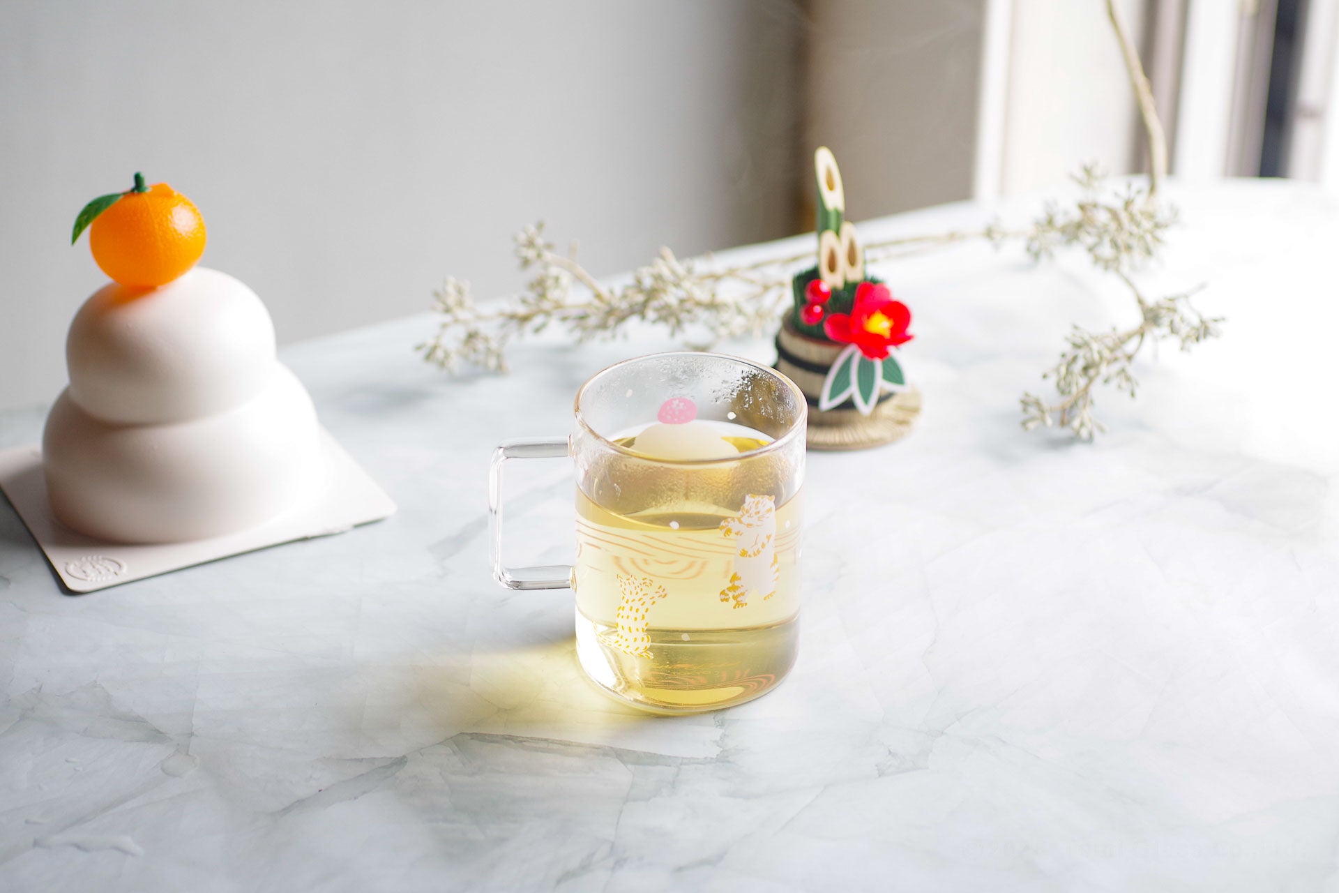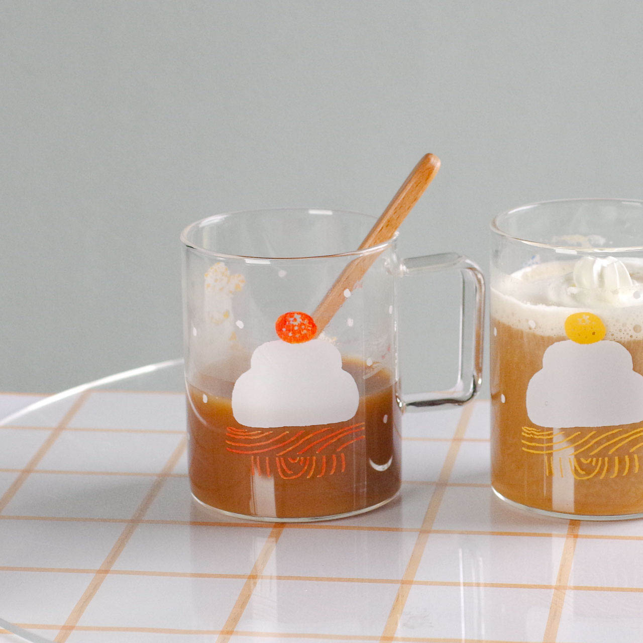 鏡もちを囲む猫のイラストがかわいい、限定5個の耐熱ガラスのマグです。