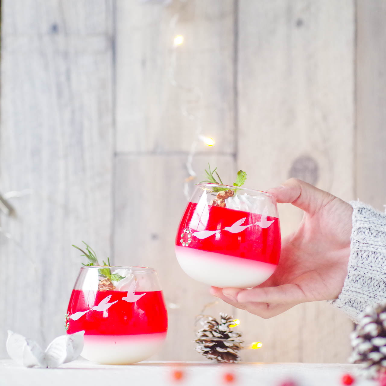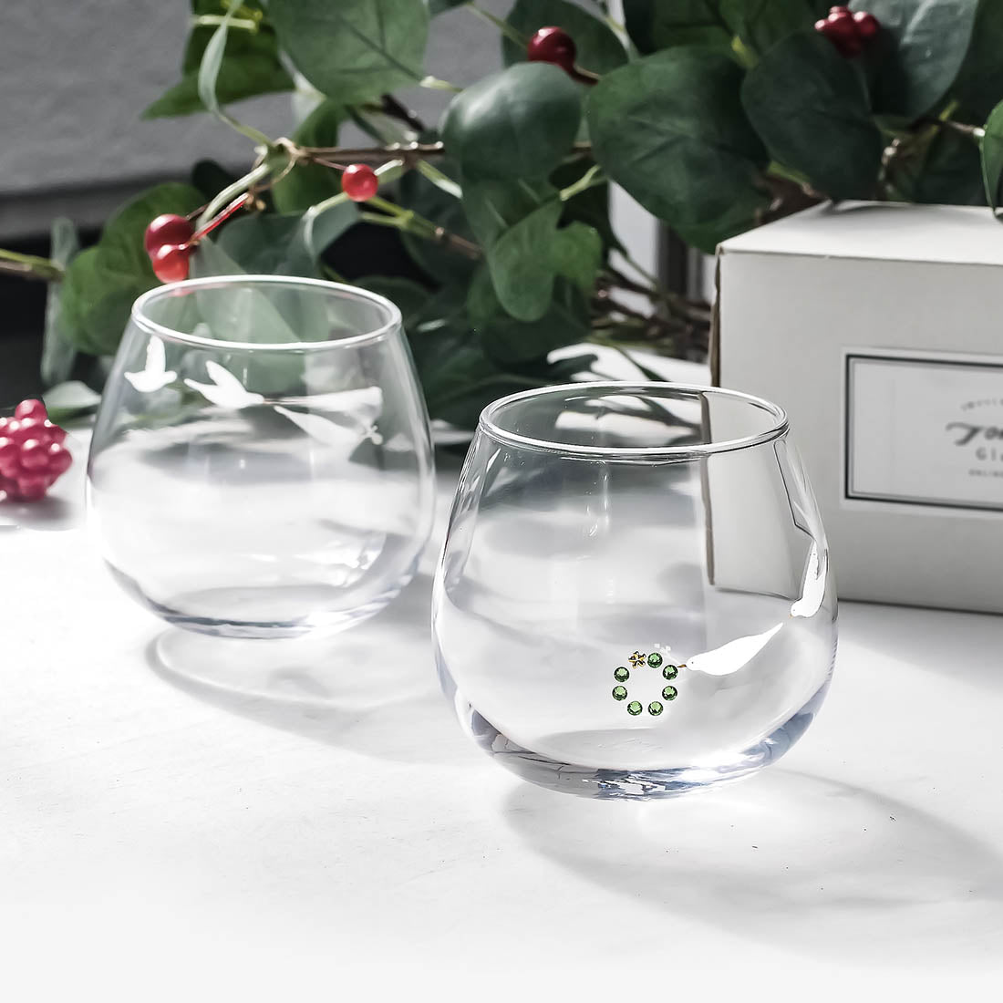 くちばしにはさりげなく金のプリント。リースのトップにも金色のチャームをあしらいました。パラパラマンガのように滑らかには動きませんが、ゆらゆらと揺れる姿に癒される、ユニークなグラスができました。あなたのクリスマスのひとときを楽しくしてくれますように。(Illustration:Anna Okanami)