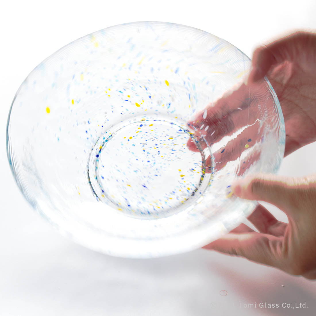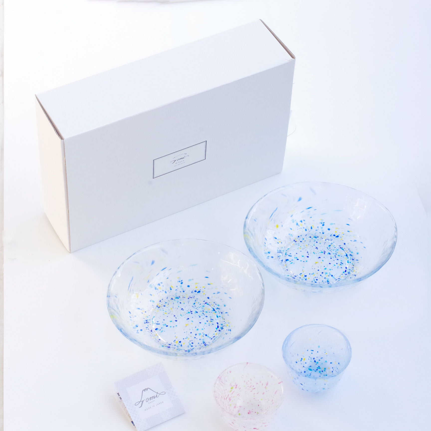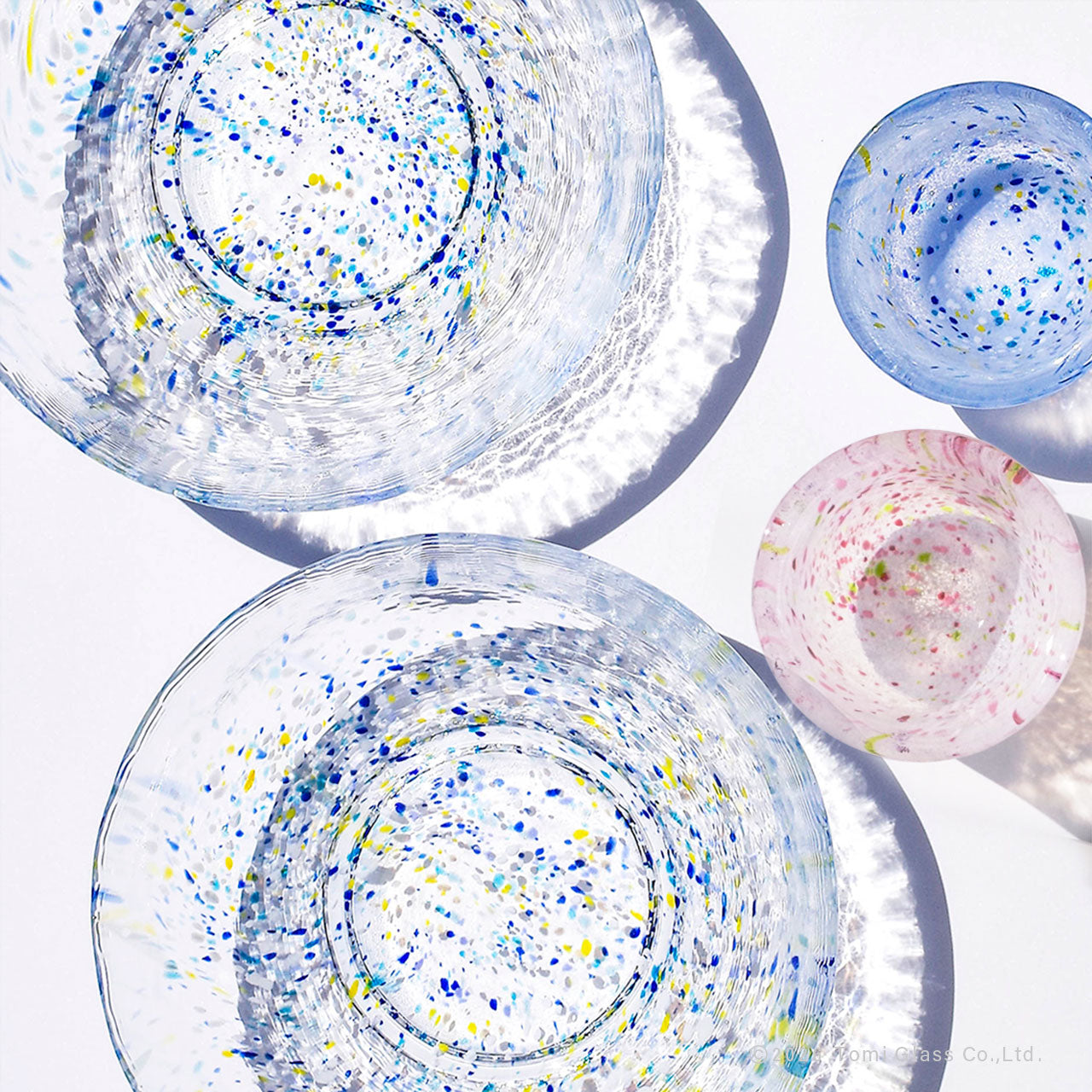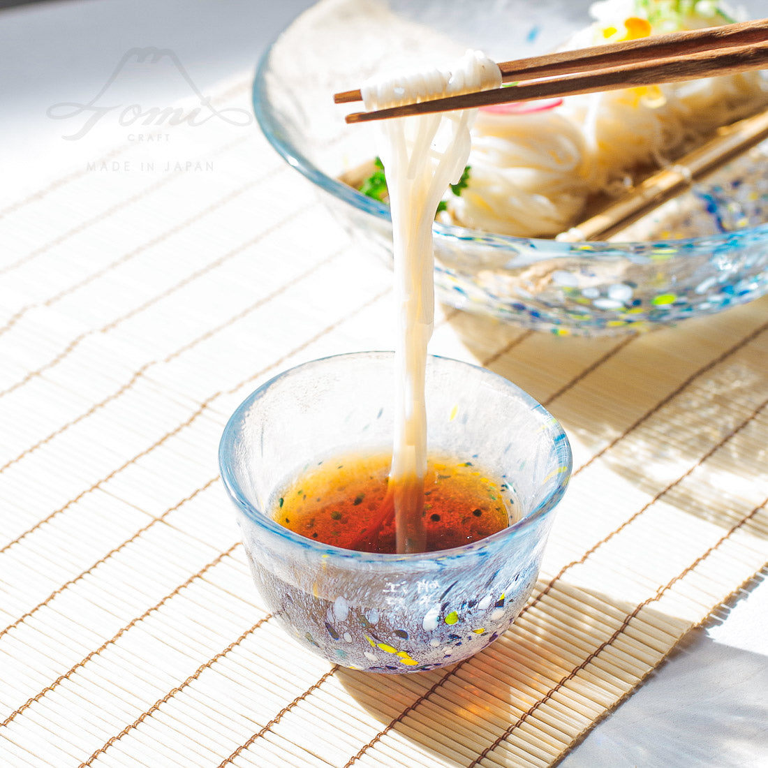 Tomi CRAFT(トミクラフト)の江戸硝子は、色粉と呼ばれるパウダーをまぶした色づけが特徴です。ガラス全体に色がはいっています(そうめん鉢のみ、透明です)。色やネーミングで江戸の文化を表現しました。