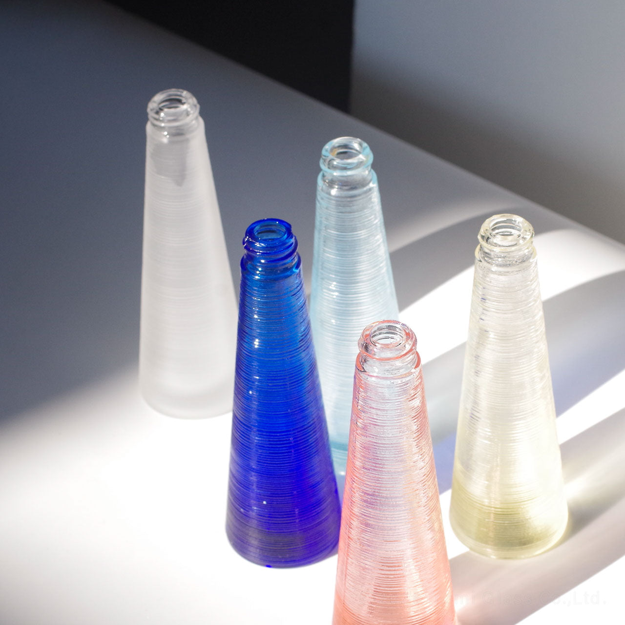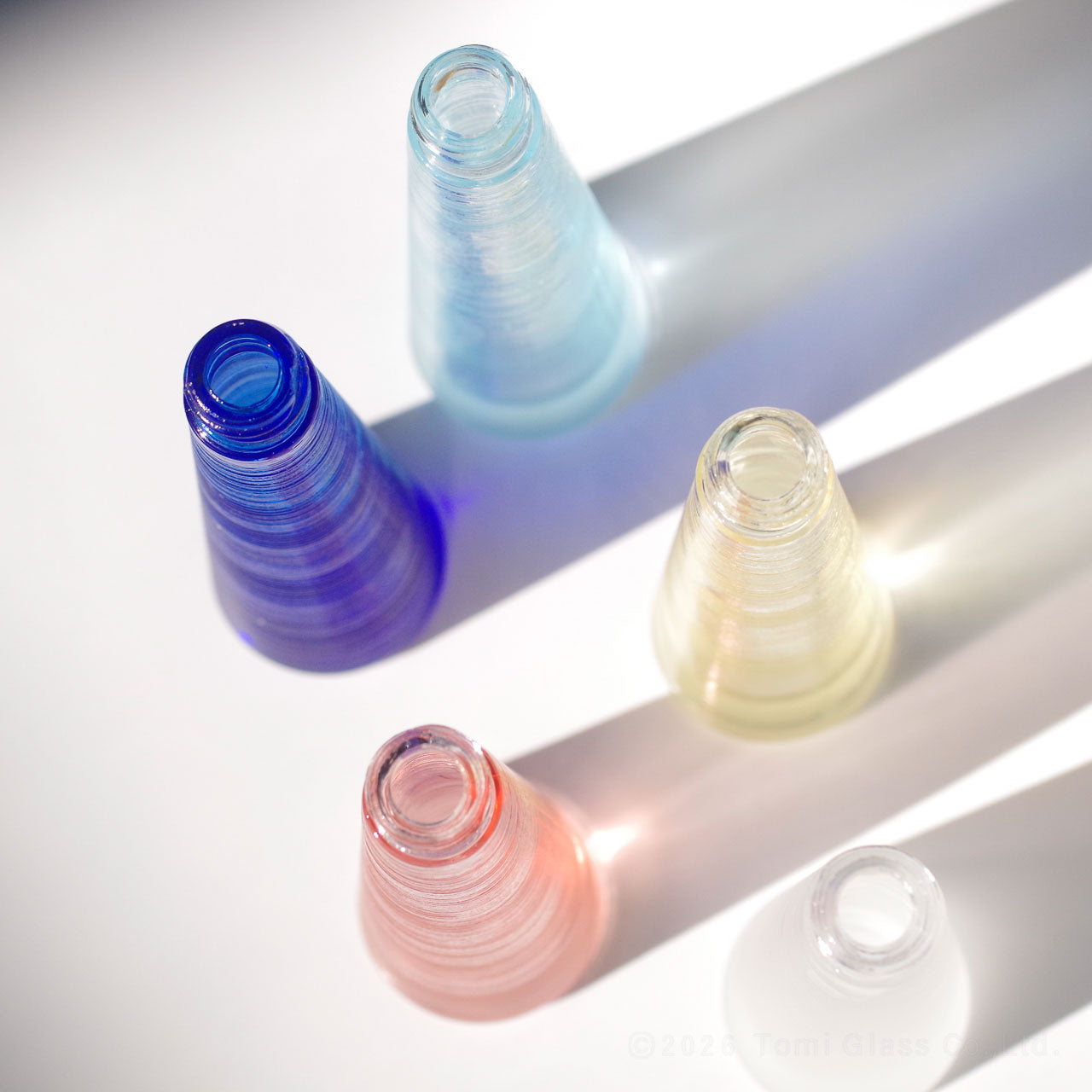 戦後、香水瓶を海外へ輸出してきたトミガラスの、歴史とノウハウが詰まったシリーズ。30~50年前に実際に江東区で生産していた小瓶です。現在では国内生産する工場が少ない、黒やピンク、ブルーなど色ガラスを使った小瓶が特徴です。